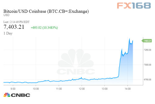 (来源:CNBC、FX168) 一位加密货币的经验老兵表示,比特币价格的上涨是受到技术水平的推动。 BKCM首席执行官Brian Kelly表示:“6800美元水平在三周内充当了巨大阻力,我认为人们在此做空,而眼下其刚刚被突破了。” 本周早些时候,资产管理巨头贝莱德证实,其已经成立了一个工作组,研究加密货币和技术。 Zero Hedge撰文指出,比特币的价格突然飙升了10%以上,突破了50日移动均线,自6月初以来首次突破了7000美元大关。 比特币现在正在测试100日均线,在30分钟内上涨了超过600美元。