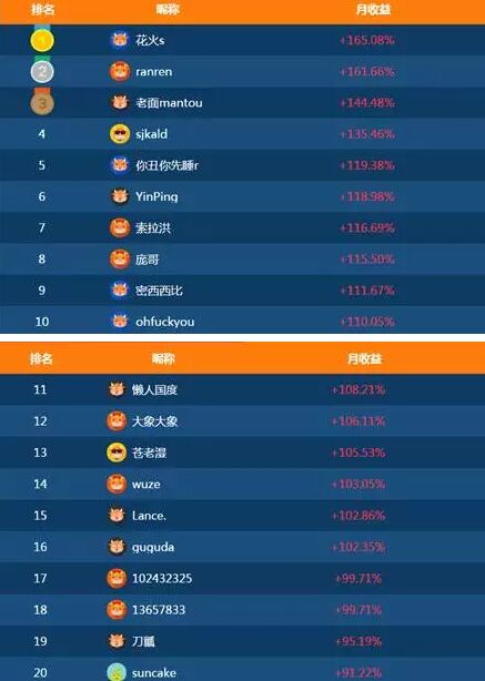 图片来源:富途牛牛,最终获奖情况以主办方核实后公布的信息为准。 回顾8月,在估值相对较低、中报表现符合预期、资金持续流入以及深港通宣布正式开通等一系列利好因素叠加下,港股指数持续上扬并创出年内新高。在此期间,参赛选手“花火S”以高达165.08%的月收益夺冠,亚军“ranren”和季军“老面mantou”也分别以161.66%和144.48%的月收益紧随其后。更为引人关注的是,月收益超过100%的参赛选手达到16位,而排名前70的选手月收益率全部超过75%。 观察领先选手持仓纪录,中小市值股票均为领跑选手的重仓股票。实际上,港股中的蓝筹股在8月表现均非常亮眼,其中金融地产成为领涨主力,随着月中深港通的正式获批,尤其是港股通投资标的进一步放开,中小盘股表现也渐渐发力。 |