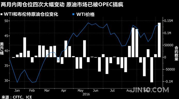 在OPEC开始讨论限产以来的两个月中,全球原油市场已经历四次大规模的周度仓位变动,WTI原油和布伦特原油在这四次的净仓位变动幅度均超过10万张,其变动规模之大,仅2011年CFTC和ICE的数据能与之媲美。CFTC净多头仓位在10月11日当周飙升至2014年7月以来最高水平,这意味着基金经理们对WTI原油的乐观心态达到两年多以来最高点。