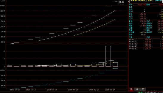2016年10月27日,五粮液·珍感觉(悦品)新股经过16个连续涨停后,价格突破100元。截止09:33分,最新报价为108.65元,较发行价上涨88.65元,新股优势明显。