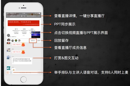 以用户体验为切入点进门财经打造四大产品功能 “奢侈浮华的会场布置、车马劳顿的长途差旅、冗长繁琐的会务管理、喧嚣混乱的现场秩序。” 财经路演的重度用户应该都对这种空中飞人式、花费大量时间和精力的商务活动深有体会。在传统的金融市场,反复重演着这些场景,并通过这种方式发布最重要的信息、传递观点并分享智慧。但各种因素时时刻刻都在干扰着信息的有效交互,而且这些低效繁琐的路演,往往连接着重大的决策和交易,影响甚大。 进门财经正是基于传统财经路演的这些痛点,以用户体验为切入点,开发了进门财经路演APP直播平台,而经过2016年6月的全新改版升级,目前平台已具备四大产品核心功能: 一、视频直播功能,可实现图文交流打赏互动、百万用户在线沟通; 二、音频直播功能 ,可实现8人同时语音连麦、满足更多场景需求; 三、PC同屏直播功能 ,可实现电脑屏幕投射直播,实操演示即时呈现; 四、PPT同步展示功能 ,可实现演示文稿全屏观看,回放留存随时点播。