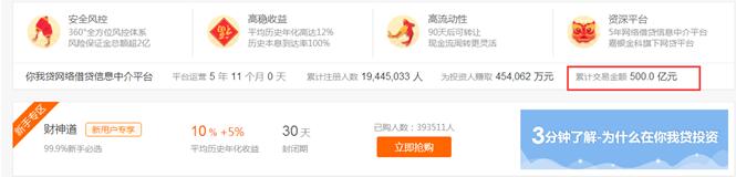 网贷平台寡头时代隐现,你我贷撮合交易总额跨入500亿时代。 5月18日,你我贷宣布,平台累计交易额突破500亿元,这家总部位于上海浦东的知名网贷平台,交易额从400亿跨到500亿仅用了5个月时间。