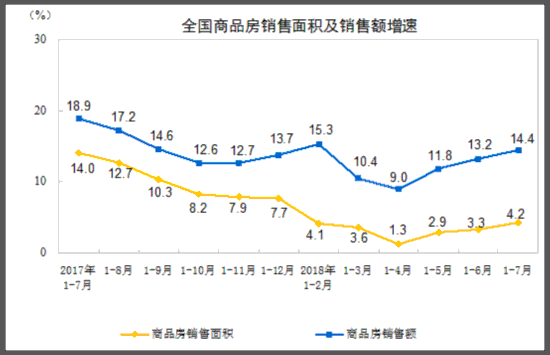 商品房销售和待售情况 1-7月份,商品房销售面积89990万平方米,同比增长4.2%,增速比1-6月份提高0.9个百分点。其中,住宅销售面积增长4.2%,办公楼销售面积下降5.8%,商业营业用房销售面积增长2.3%。商品房销售额78300亿元,增长14.4%,增速提高1.2个百分点。其中,住宅销售额增长16.2%,办公楼销售额下降2.1%,商业营业用房销售额增长5.5%。