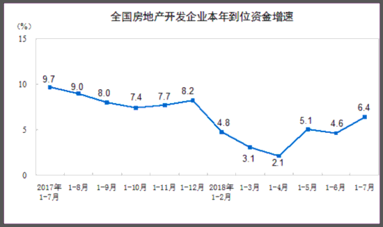 1-7月份,东部地区商品房销售面积36859万平方米,同比下降3.8%,降幅比1-6月份收窄1.6个百分点;销售额42217亿元,增长5.8%,增速提高1.9个百分点。中部地区商品房销售面积25131万平方米,增长12.7%,增速回落0.1个百分点;销售额16844亿元,增长26.5%,增速回落0.5个百分点。西部地区商品房销售面积23938万平方米,增长10.5%,增速提高0.5个百分点;销售额16247亿元,增长28.3%,增速提高0.1个百分点。东北地区商品房销售面积4062万平方米,同比持平,1-6月份为下降1.1%;销售额2992亿元,增长15.8%,增速提高1.7个百分点。 7月末,商品房待售面积54428万平方米,比6月末减少656万平方米。其中,住宅待售面积减少544万平方米,办公楼待售面积减少40万平方米,商业营业用房待售面积减少48万平方米。 房地产开发企业到位资金情况 1-7月份,房地产开发企业到位资金93308亿元,同比增长6.4%,增速比1-6月份提高1.8个百分点。其中,国内贷款14045亿元,下降6.9%;利用外资33亿元,下降70.1%;自筹资金30187亿元,增长10.4%;定金及预收款31013亿元,增长15.1%;个人按揭贷款13655亿元,下降1.4%。