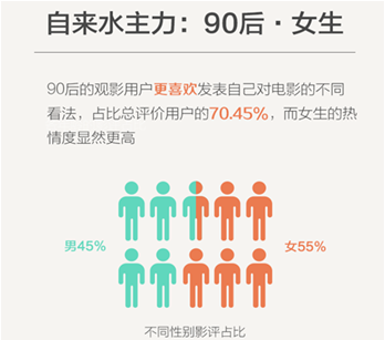 这让更多电影公司在电影生产制作各环节都要越来越重视年轻观众的选择。在更受女性观众青睐的淘宝电影平台,女性用户在爱情、科幻、动画、喜剧四个类型电影最热衷爱情电影,与男性相比,女性观众也更爱在各种平台发表评论,在口碑已经成为今天影响票房的重要因素后,90后的评论也变得愈发重要。