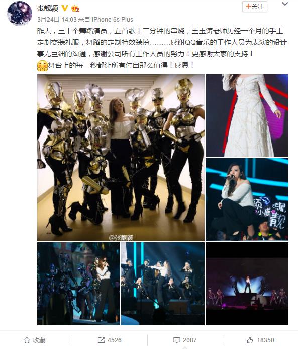 在前不久的2016QQ音乐巅峰盛典上,担纲开场重任的张靓颖以一席白色婚纱惊艳亮相,并与前两届上的自己上演“穿越对唱”,随后又携30名舞蹈演员、带来包括好莱坞电影《终结者:创世纪》全球主题曲《fighting shadows》在内的动感的舞曲串烧——这段长达12分钟的创意演出也瞬间刷爆社交平台,成为乐坛佳话。在后台采访中,张靓颖透露,对于盛典这样的重要演出,自己全程主导、创作、参与了所有环节,尤其是在歌曲的选择上,也是参考在QQ音乐的热门程度才最终定下。