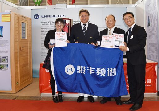 也正因如此,作为一家致力于家庭健康服务事业的企业,骏丰公司凭借着超强的自主创新能力在国内屡获殊荣,产品获得了中、美、英、澳、新(加坡)等多国发明专利,先后在第22届美国匹兹堡国际新发明新产品博览会和第55届尤里卡国际新发明新技术博览会上获得了“电子电器科技类金奖、生物科技类银奖、医学科技类银奖”,“骏丰频谱”这一中国品牌更是得到国际社会越来越多的关注与认可。 2015年4月19日,广东骏丰频谱股份有限公司更是荣获第43届日内瓦国际发明展上,公司研发生产的骏丰频谱水治疗保健仪JF-139型、骏丰频谱治疗保健仪JF-802型、骏丰频谱治疗保健房JF-902C型“内喝外照”生物频谱产品一举获得3项银奖,在700多个参展者中脱颖而出,成为此次发明展获奖最多的参展企业。骏丰频谱再次在国际舞台上展示了骏丰人崇尚创新、善于创新的精神风貌。 日内瓦国际发明展国际评审委员会主席大卫·塔纪还专程来到骏丰频谱展位为骏丰代表团颁发奖章和奖状,称赞“骏丰频谱能在所有参展企业中名列第一,实属不易!”