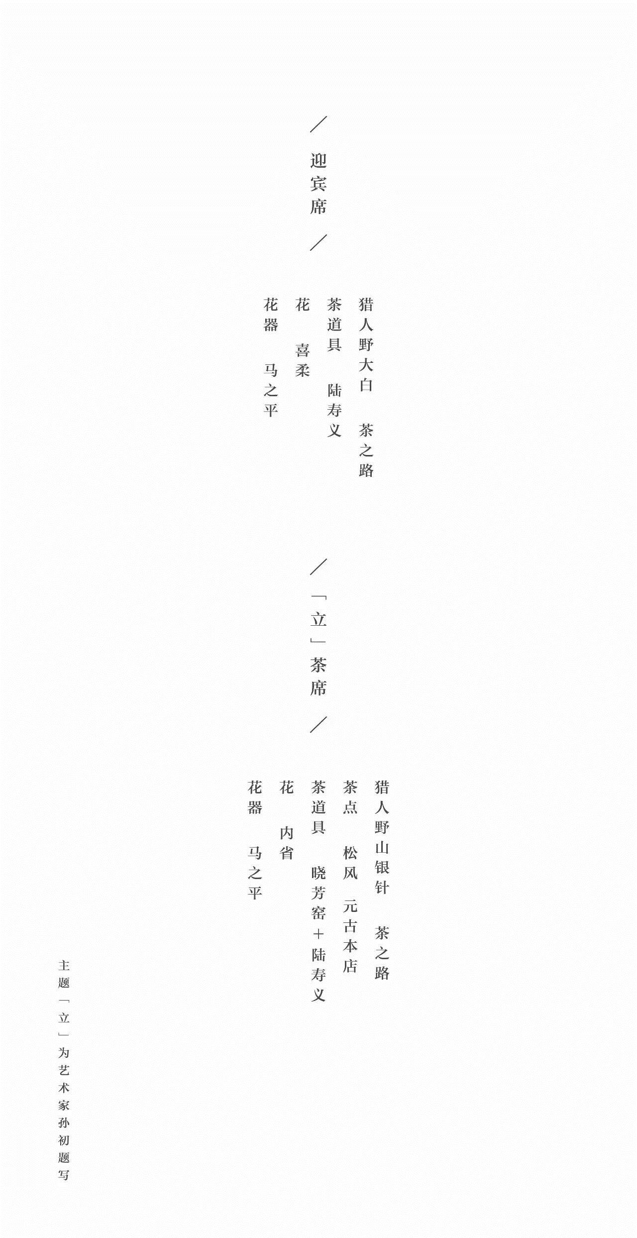 ▵ 茶之路系列纪录片《猎人》 导演 摄影 剪辑 / 马岭 采访 / 夏楠 02森林之茶 - 新季猎人野山茶品鉴 茶聚现场野山茶品鉴分为两席——迎宾席及「立」茶席。迎宾席特选的猎人野山银针,为政和白茶。野山银针经自然萎凋,外形细秀,线条笔立,不仅形立,且包容自然万物,举重若轻,与「立」主张一致。冷泡之后,野气盎然,干净本真,一句简单的“请喝茶”,希望能为从喧嚣进入静谧空间的素人们递上一份清凉。