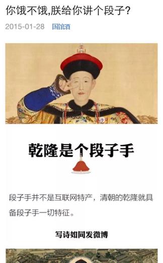 根据笔者统计,国馆号平均每周都会有3-4篇10万加的内容,平均阅读量达到8万级别。这对于一个企业公众号来说,这是一个不可思议的数据。 变革内容,传统文化与互联网跨界碰撞新火花 24小时阅读量破100万,48小时阅读量达到千万级别。这些数据来自国馆酒2015年的一篇广告软文——《你饿不饿,朕给你讲个段子》。以卖萌的方式讲述严肃的帝皇历史,打造出一个白酒行业中绝无仅有的经典案例。随后,承接着这场由自己掀起的风潮,国馆陆续推出《买到假货,朕怒了》和《Papi酱算什么,东坡酱才是国民网红》等爆文,将古代红人与自身捆绑在一起,令古人为品牌“代言”。