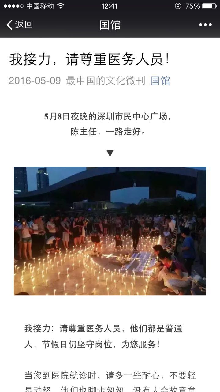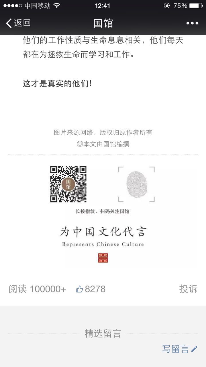 紧跟社会热点也是自媒体创作的重点。但与其他大号盲目跟热点不同,国馆都是选择涉及到文化信仰和争议的新闻,引起社会话题,传播最中国的正能量。一篇向医务人员致敬的文章——《我接力,请尊重医务人员》,借“陈医生被砍事件”呼吁理解和尊重医护群体,达到了百万级的阅读量和超过8000的点赞数,这样惊人的数据背后,是热点的力量,更是其蕴含的关于道德、教育和文化的精神催化。