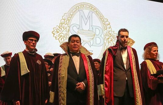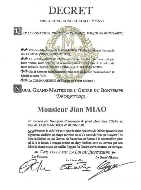 摘要:5月24日,红酒世界董事长苗健先生受邀参加由法国波尔多左岸骑士会举办的授勋晚宴,并在官方授勋仪式上被授予荣誉勋章。 5月24日晚,红酒世界董事长苗健先生受邀参加由法国波尔多左岸骑士会(Commanderie du Bontemps de Medoc, des Graves, de Sauternes et de Barsac)在香港君悦酒店举办的授勋晚宴,并在官方授勋仪式上被授予“法国波尔多左岸骑士会荣誉勋章”,以表彰他本人及其带领的红酒世界团队在对波尔多(Bordeaux)葡萄酒的推广及教育中所做出的杰出贡献。