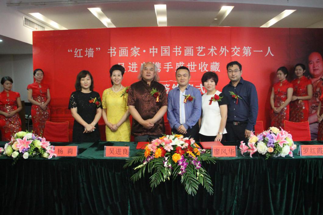 签约仪式正式达成 吴进良大师与盛世收藏签约现场 吴进良,是中南海内部御用画家,中国三代国家领导人都有收藏他的作品;他也是中国书画艺术外交第一人,全世界有100多个国家元首政要都收藏了他的作品,曾被联合国文化总署授予“文化大使”的荣誉称号。吴进良先生教书育人,还亲自向世界各国大使传授中国书画,被誉为中国“红墙”书画家。 近年来,吴进良先生的作品受到市场的热烈追捧,在各大拍卖会上屡创新高,2005年,吴进良先生的国画作品《合家欢·大吉大利》在香港嘉士得更是以1118万人民币拍出,创造了个人作品拍卖的最高纪录,震惊海内外。 在签约现场,吴进良先生与到会的各界领导、重要嘉宾、新闻媒体以及盛世收藏的全体员工,分享了的系列作品《吉祥三宝》的创作经历,据了解,吴进良的系列作品《吉祥三宝》是被国家领导人收藏最多的三大题材,全套共有三个系列,这些作品完美展现了吴进良先生深厚的艺术造诣。