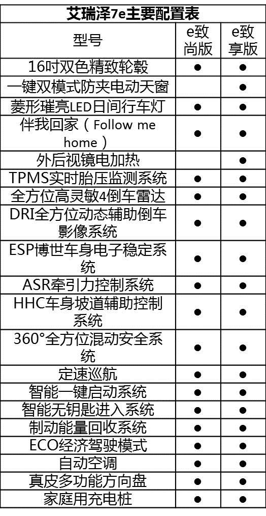 艾瑞泽7e拥有e致尚版和e致享版两个配置版本,其基础的舒适配置和安全配置都非常全面,无钥匙进入、一键启动、自动空调、真皮多功能方向盘、定速巡航、ESP、胎压监测、等都是标配,为用户带来了更舒适、更安全的用车体验。