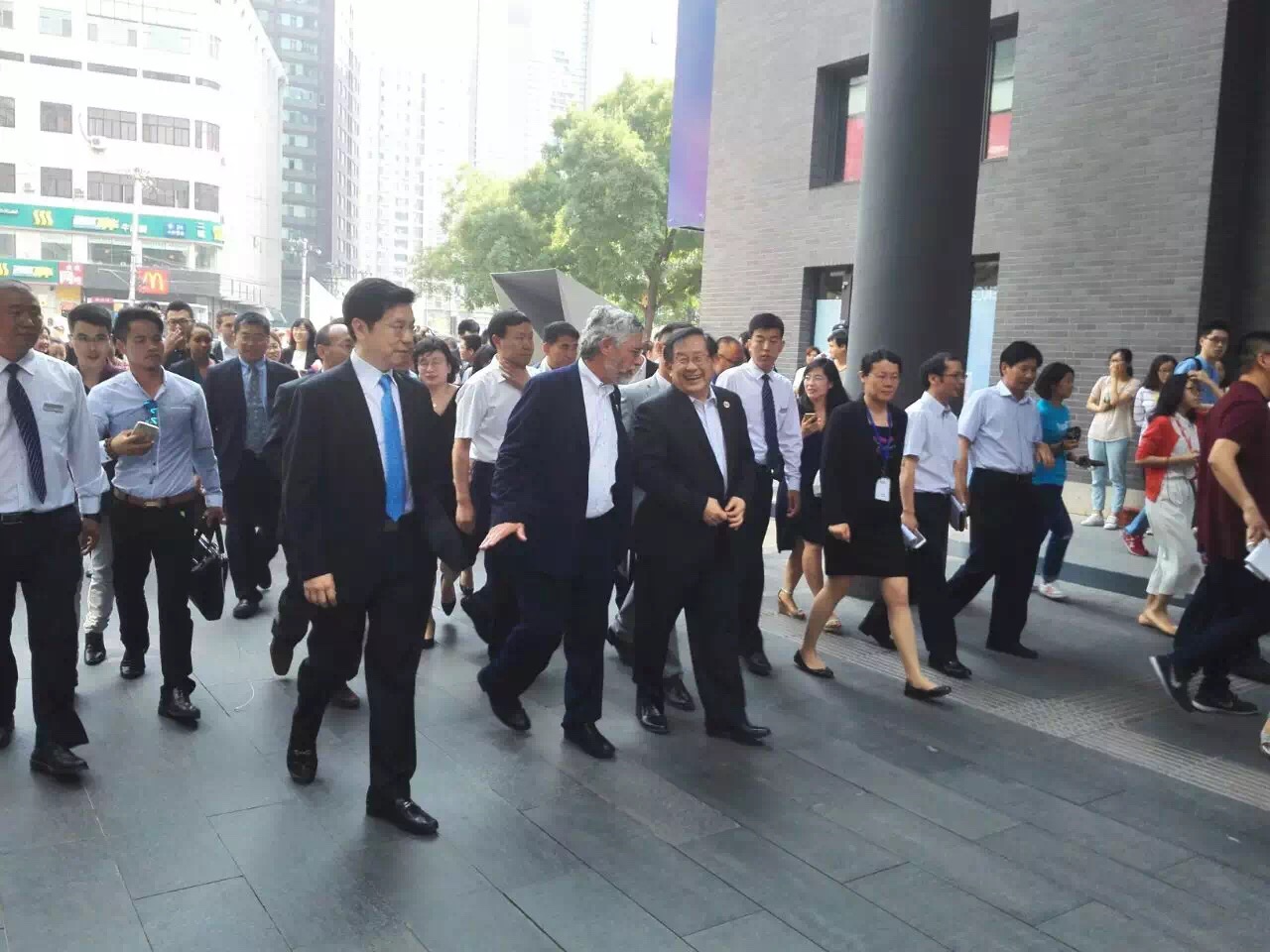 第一排 左三国家科技部长万钢 左二白宫大使霍尔德伦博士 左一李开复 参观团一行来到京东奶茶馆北京中关村店