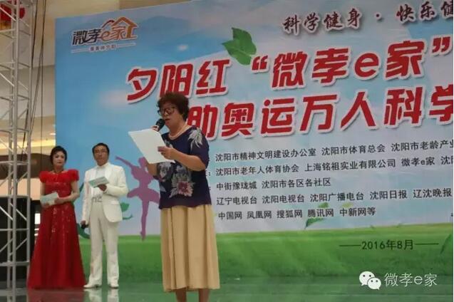 “科学健身 快乐健心”夕阳红“微孝e家”助奥运万人科学健身展演赛即于8月10日在中街豫珑城举行,为期3周。此次大赛由沈阳市精神文明建设办公室、沈阳市体育总会、沈阳市老龄产业协会、夕阳红为老服务项目管理委员会主办,沈阳市老年人体育协会、上海铭祖实业有限公司、微孝e家、沈阳市北方老龄艺术团承办,中街豫珑城、沈阳市各区各社区协办。还得到海尔、金龙鱼、中粮、爱康国宾、中农科、井泉、老兵等的友情赞助支持,e起给中老年人提供健康生活。当天到场的队伍有25个,主要包括大东、浑南、沈北新区等。最终大东爱心舞蹈队的《中国美》以8.24分获得"日冠军"。