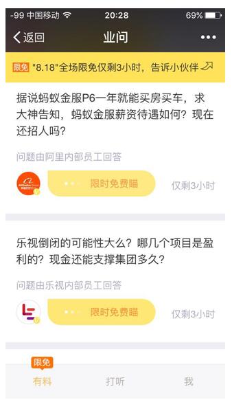 除了关于蚂蚁金服福利待遇问答,“乐视收购锤子这事儿有谱没”?“传百度糯米加百度外卖打包给新美大,求内幕。”“李彦宏和马东敏离婚了?”等问答话题也十分火爆。 其实,这样的情形对于“业问”来说并不意外,该产品7月份正式推出后,仅一个月时间即收获了大批用户。通过“业问”公众号,网友可以向各公司员工匿名悬赏提问,问题不限于公司的发展、管理、薪酬、文化等,而这些悬赏提问则会定向推送给平台上该公司的实名认证员工,邀请其通过文字形式为提问者做最真实有效的匿名解答。同时,其他围观用户均可对答案进行“一元偷瞄”,而问题收益则由问、答双方共享。 很显然,“业问”对于职场人士来说,无疑是一款“升职加薪”利器。通过“业问”,职场人士可以快速打破公司间的信息壁垒,求职者将告别“睁眼瞎”时代,随时随地通过“内部人士”,了解更多有用信息。 |