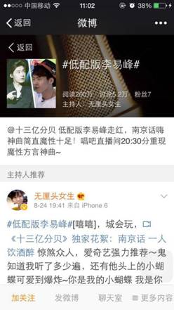 一时间,关于“李易峰”嗨唱神曲也在网上引发热议。有眼尖的网友发现,《十三亿分贝》中嗨唱神曲的“李易峰”实则是国内某音乐直播间主播。消息一经放出,#低配版李易峰#更是成为新浪微博热议话题,1小时内,微博话题阅读量便达到200万。而关于“低配版李易峰南京话嗨神器”的视频花絮也被爱奇艺强烈推荐至首页。
