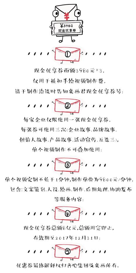 2016年8月27日,在来画一周年庆暨平台发布会上,宣布推出“齐来优享手绘新视觉计划”,参与到齐心集团大办公全生态战略中,为企业提供增值服务。来画将向全国市场投放10万张专属优享券,赠与齐心办公合作的中国企业,可用于抵扣来画手绘平台上的部分制作费用。