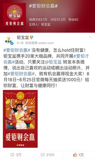 借势营销狂欢落幕,大家凭啥记住你? 国际运动比赛借势营销从来都是快消品和运动品牌们的主战场,而今互金品牌也来凑热闹,还掀起不小“风浪”。 作为互联网金融信息服务平台的钜宝盆,此次事件营销也花了不少心思。8月18日,钜宝盆联合20家国内知名品牌举行“爱钜财会赢”送福利活动,只要说出自己最喜欢的运动或晒出运动图片即有机会赢取奖金,让粉丝躺在家里也能夺“金”!活动形式简单直接,极大增强了粉丝的参与度。活动历时8天,截止至8月25日,#爱钜财会赢#一直在微博话题排行榜里居高不下,话题阅读量高达3183.1万,讨论12.3万。财经蓝v如魔鬼金融学、中国商界网、商界智库、蓝鲸财经网以及知名黄v我的前任是极品、happy张江、追风少年刘全有、Houson猴姆、娱三少等各界微博大V们也纷纷转发了钜宝盆此次活动微博。