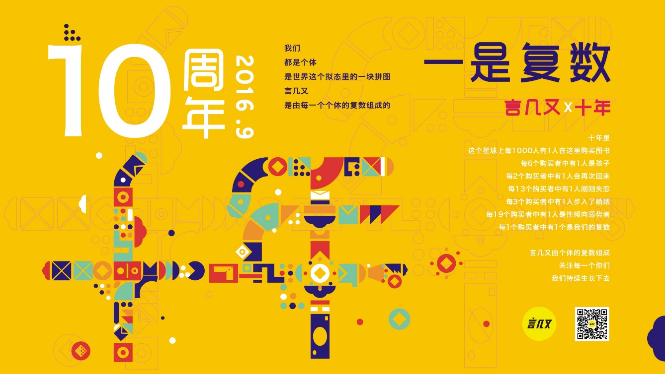 (2016年9月9日——北京)十年的时间里你能做什么?过着千篇一律的生活还是在一次次挑战中突破自我?亦或是在文化的沉淀中发现一个全新的自己?作为城市文化的代表,在2016年9月9日迎来自己十周年生日的言几又,有着自己独特的表达方式。第一个十年,言几又以“一是复数”作为主题,一方面对每一个组成言几又这个整体的个体表达谢意,另一方面更表达了每一个个体都以各自独特的姿态代表着言几又这个整体的概念。