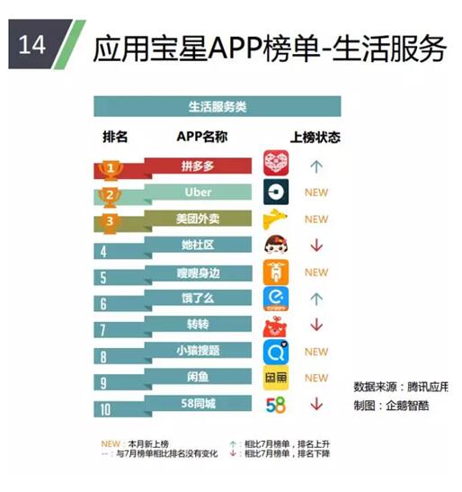 作为国内领先的移动互联网第三方数据挖掘和整合营销机构,腾讯应用宝从下载指数、飙升指数、好评指数、分享/收入指数、反馈指数、新鲜指数六个维度进行综合评判,从而选中各领域评分前列者。记者发现娱乐和生活类APP最受欢迎。 在生活服务类排行榜中,除了大众熟知的58同城和饿了么等,一个新面孔的入榜不得不吸引人的目光。排名第五的是一款叫“嗖嗖身边”的APP,甚至连“饿了么”都排在她后面。