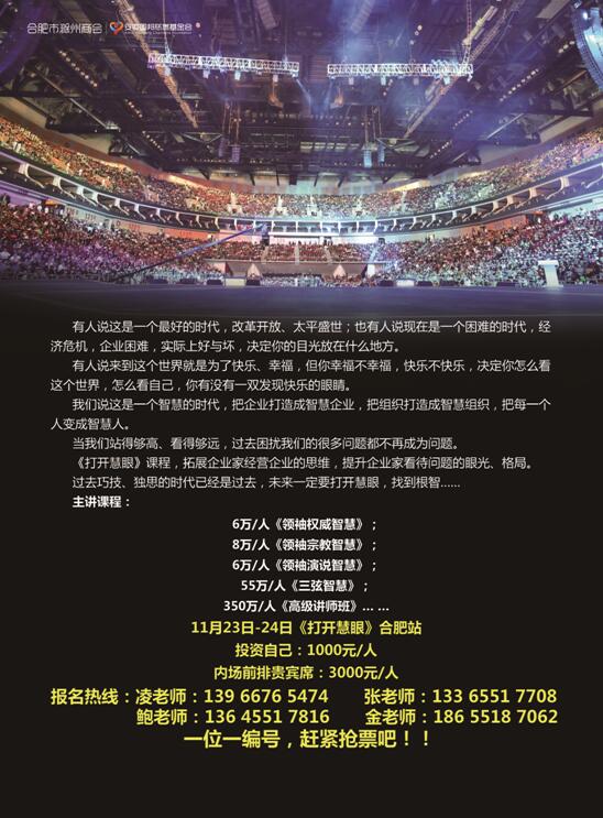 作为家长,您真的知道该怎样教育孩子吗? 很多父母是这样认为的:家庭教育就是不能让孩子输在起跑线上,也就是说孩子在两三岁的时候必须开始背唐诗、宋词,上小学了就要请家教、报各种兴趣班,成绩一定要名列前茅,一定要有一门特长,将来一定要上名牌大学......在中国,似乎只有这样,父母的教育才算成功,孩子才算成才。 试想,如果一个孩子缺少对生命的认知,没有梦想的能力,不懂得保护自己,无法与别人共享,那么,即使这个孩子门门功课考第一,又能怎么样? 有时候我们需要静下心来看看我们生活的这个世界吧!它既陌生,又新奇;既刺激,又危险。其实孩子的成长需要一个故事、一场旅行、一片风景、一个独立的思想......每个孩子都有自己的潜能,你需要拥有一双智慧的眼睛去发现它! ★ 11月23-24日刘一秒老师将亲临合肥,助你打开慧眼!事业、婚姻、财富、健康、育子...... 刘一秒老师《打开慧眼》研讨会将让你在以上几个维度远离纠结与困惑,进入全然的新生!需要改变人生轨迹的你,快来为你和你的爱人,家人,管理团队报名! 主讲老师:刘一秒老师; 投资自己:1000元/人; 内场前排贵宾席:3000元/人。 一位一编号,赶紧抢票吧!! 报名电话:凌老师:0551-6373 9279、139 6676 5474 张老师:133 6551 7708 鲍老师:136 4551 7816 金老师:186 5518 7062
