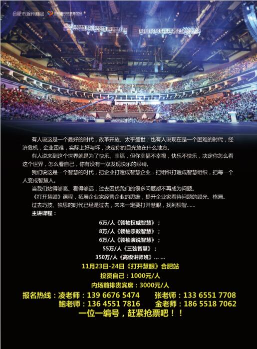 为什么《打开慧眼》如此火爆?原因有几大方面。 第一、企业家认知:不学习,企业必死无疑 二十多年前,机遇无数,只要创业,只要有产品,就不愁销路和利润。只要有人脉或者有资源,很多人能成功。 在过去几十年,人脉和资源比见识和眼光重要。而现在,市场竞争惨烈,很多人有了人脉和资源,在市场竞争面前依然惨败。这让很多企业家认识到:在日益公平公正的市场竞争面前,人脉和资源已经越来越不重要了,小聪明也更加不重要了。只有见识、眼光和格局,才是企业致胜的最终武器!而提升见识、眼光和格局的唯一方法就是学习!尤其是和高手学习! 世界上取得巨大成就的著名企业家,每一个都是非常喜欢学习的人! 比尔盖茨如此! 乔布斯如此! 李嘉诚如此! 马云如此! 张瑞敏如此! …… 而每一个著名的企业家,他们都经常公开说明:学习非常重要! 市场在不断变化,只有看清未来的市场变化,才可能在竞争中获胜! 而要看清未来市场的变化,唯有学习!唯有不断学习! 无数的民营企业家已经越来越清晰地认知到一点: 这个时代,不学习、不进步,企业必死无疑! 当无数的企业家认识到必须学习、不断学习时,问题来了: 1、学什么? 2、和谁学习? …… 《打开慧眼》拥有智慧,解决困惑,让自己懂得怎么学习,看到整个世界的美~11月23日刘一秒老师与您相约合肥!小伙伴们,企业家们,快来为你和你的爱人,家人,管理团队报名吧! 主讲老师:刘一秒老师; 投资自己:1000元/人; 内场前排贵宾席:3000元/人, 报名电话: 凌老师:0551-6373 9279、139 6676 5474 张老师:133 6551 7708 鲍老师:136 4551 7816 金老师:186 5518 7062 一位一编号,赶紧抢票吧!!