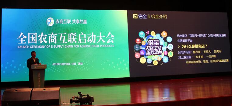 10月10-11日,全国农商互联启动大会在潍坊鲁台会议中心举行。大会以“农商互联 共享共赢”为主题,大会深入探讨了解决农产品生产标准与网络标准、生产与消费间有效对接的难题,旨在打造以电商为核心的新型供应链,构建农产品高效安全流通长效机制,商务部部长助理王炳南、山东省副省长夏耕、国家标准委副主任崔钢、农业部市场经济与信息司司长唐珂、潍坊市市长刘曙光等出席大会。作为互联网+流通的创新商业形态,倍全公司创始人吴少斌受邀参会并做了主题为“发展社区体验电商,驱动农产品精准流通”的发言,分享了倍全在农产品精准流通方面的创新经验和做法。他表示,农产品作为一种对生产、储藏、运输、销售有严格要求的商品,需要充分发挥各环节的力量,倍全将发挥在社区体验电商方面的优势,与全国涉农企业共同打造农产品全产业链联盟,共同推动解决农产品“难买难卖”的难题。