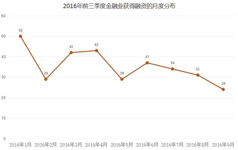 每年的十一长假,让该年度的第三个季度完美画上句号。距离2017年仅剩下80天的当下,统计今年前三个季度的数据,为最后一个季度的规划做参考。据不完全统计,2016年前三季度,我国金融业共获得319次融资,累计融资金额不少于1050亿元,融资金额远超美国金融业。北京、上海、深圳和杭州分别获得108次、85次、55次和35次融资,为国内城市前四。P2P、保险、理财和消费金融是获得融资次数最多的四种细分业态。 不太冷的“资本寒冬” 今年融资次数整体呈现出下行趋势,但月均融资次数分布较为均匀。