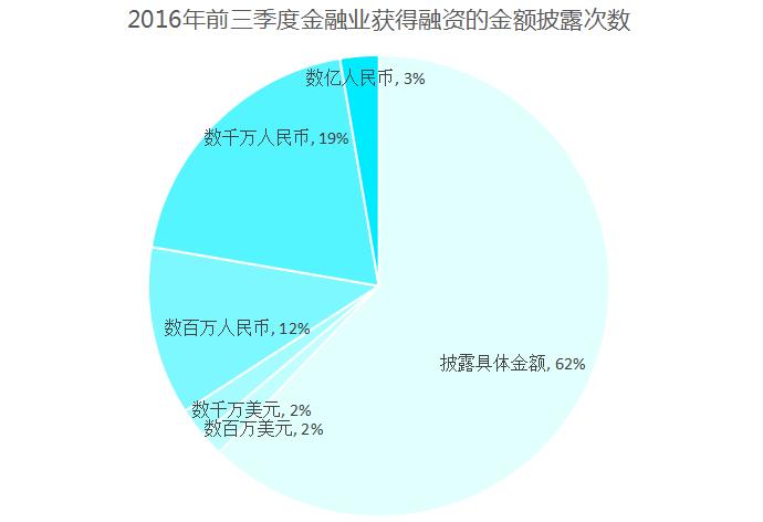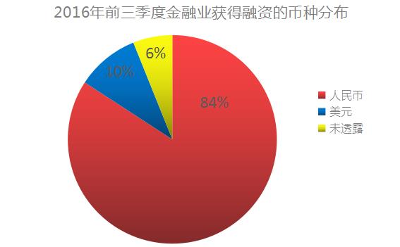 今年前三季度的融资中,共有184次融资披露了具体数额;58次融资披露情况为“数千万人民币”;35次融资披露情况为“数百万人民币”;8次融资披露情况为“数亿人民币”;6次融资披露情况为数千万美元;5次融资披露情况为“数百万美元”。根据已经披露具体数额的融资数据统计,我国金融业前三季度融资额累计1050.6亿元人民币。根据美国风险投资协会数据,美国金融业上半年累计融资额为14亿美元,而中国仅蚂蚁金服在上半年单笔融资高达45亿美元。由此可见,中国远远超于美国金融业融资水平。