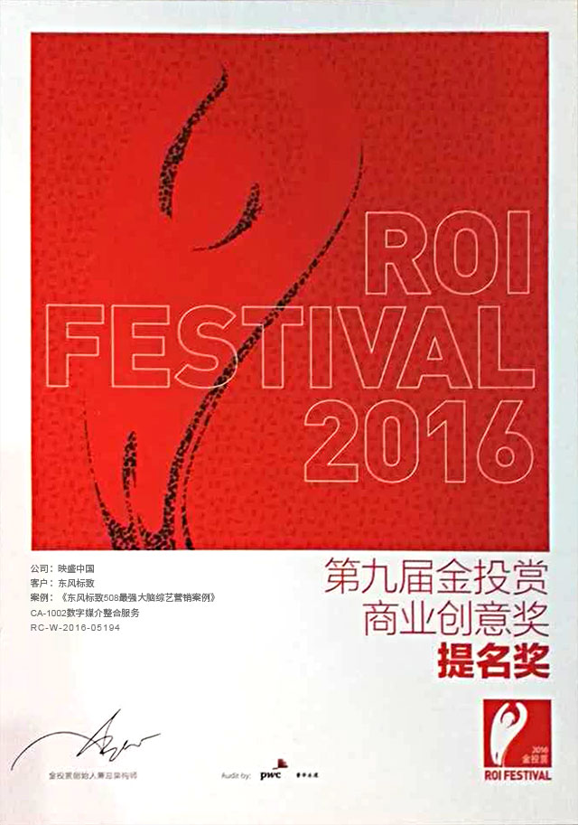 2016年10月20日,由金投赏组委会主办的第九届金投赏颁奖典在上海商城剧院隆重举行。映盛中国,作为最早涉足互联网营销的专业服务商,凭借在互联网领域的杰出表现,选送的《东风标致508最强大脑综艺营销案例》获得 “数字媒介整合服务大奖”。