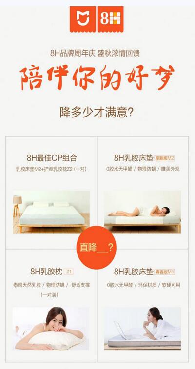 生日怎么过?K歌?轰趴?饭局?你OUT啦! 8H两岁生日任性邀你共度周年庆! 回顾8H的两年,出品了许许多多深受大众喜爱的好物。有创造了众筹奇迹的8H乳胶床垫青春版M1,有世上最强枕头8H乳胶功能枕Z2,有一经上线就引发米粉抢购热潮的8H乳胶护颈枕U1。 除了匠心好物,8H也一直与你同在。还记得那些年在街头惊现的8H床车,风靡全城的乐活青春8H枕头大战,8H枕头盒子创意大赛,七夕礼遇8H带你逃离北上广,医诺千金爱心公益。 经过两年努力,8H已经成为互联网睡眠家居新锐企业,估值达七亿人民币。8H将继续为全球消费者提供健康环保的优质睡眠用具,并会不断丰富产品线,为国人提供超高性价比的精品国货。 8H一直在坚持,陪伴你的好梦 累了,今天睡好一点