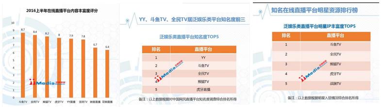 图2 而全民直播作为直播平台中的后期之秀,却有着惊人的发展速度,靠着自身内容、主播、商业模式创新等成功跻身行业第一梯队的位置,势有与斗鱼、熊猫三分天下的劲头。第三方数据机构iiMedia Research(艾媒咨询)权威发布《2016上半年中国在线直播市场研究报告》,报告中显示,全民直播作为后起之秀,在用户满意度、平台内容丰富度、平台明星IP丰富度等维度稳占行业第二,直逼行业首位地位。