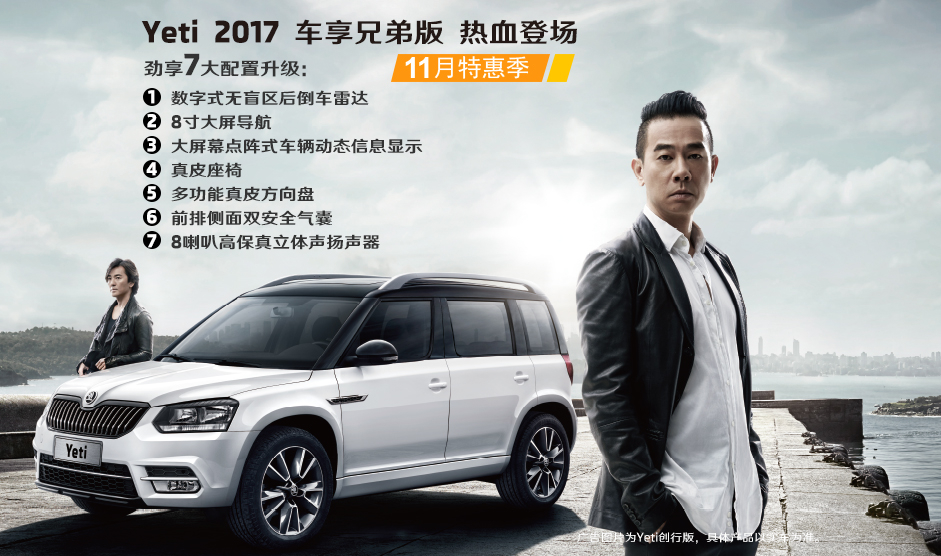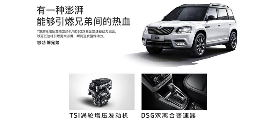 车享定制独享特惠 斯柯达Yeti车享兄弟版由斯柯达Yeti和上汽集团全生命周期O2O汽车电商平台——车享联合打造,在Yeti 280TSI 手自一体兄弟版的基础上,升级了8寸大屏导航、真皮座椅、多功能真皮方向盘、数字式无盲区后倒车雷达、前排侧面双安全气囊等7大配置,兼具硬朗个性的外观、强劲出众的性能和舒适尊贵的驾乘体验,大器非凡。