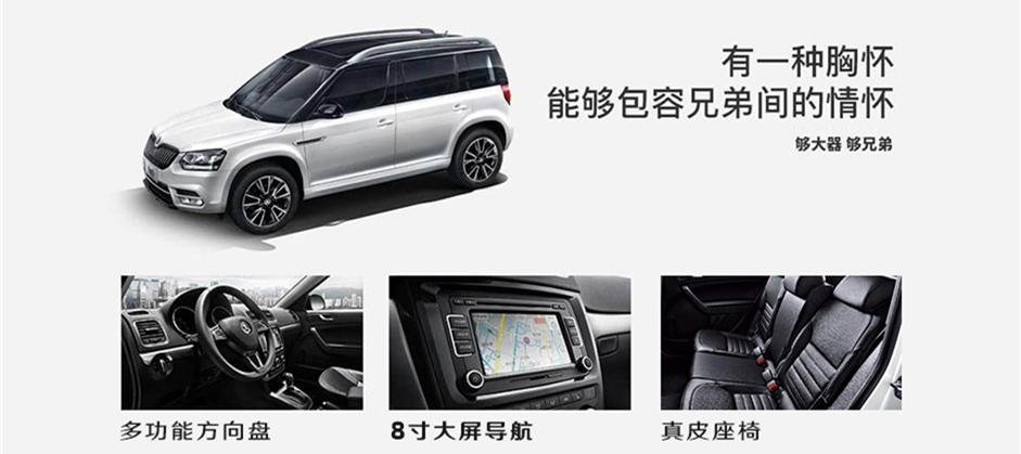 该车拥有一气呵成的动感车身线条,硬朗方正的整车造型,动感中体现分明的层次,尽显硬派时尚风采。够“野”够粗犷,给您带来超高的回头率,满足您想“野”的冲动。 够大器,够兄弟 斯柯达Yeti车享兄弟版还在原车的基础上,升级了8寸大屏导航、大屏幕点阵式车辆动态信息显示、真皮座椅、多功能真皮方向盘、8喇叭高保真立体声扬声器等“高大上”配置,质感满分,同时熨帖驾驶的辛劳,大器非凡又贴心十足。
