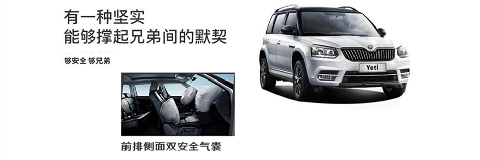 够安全,够兄弟 在安全性能上,斯柯达Yeti车享兄弟版同样值得信赖。车享兄弟版升级了数字式无盲区后倒车雷达、前排侧面双安全气囊等功能配置。PDC数字式无盲区倒车雷达最远探测距离可达1.6米,侧后方雷达探测距离为0.6米,通过提示声音了解后方障碍物距离,还能了解后方障碍物方位,方便倒车,减少擦碰事故发生。 前排座椅侧面配备的侧面安全气囊,容积达到11升,能在撞击瞬间充气,缓解冲击能量,在发生侧翻时,有效保护驾乘人员的腰部和肩部。更值得强调的是,Yeti配置的安全气囊都经过了严苛的测试,例如在90度-零下30度极端条件下气囊依然可以正常工作。为您和家人朋友的安全保驾护航,充分保障用车安全!