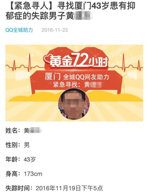 “【紧急寻人】寻找厦门43岁抑郁症失踪男子黄某某”。11月23日,厦门超过371万手机QQ用户,收到了来自QQ全城助力的一条紧急寻人信息。 11月19日傍晚,厦门市民黄先生离家外出后与家人失联,由于黄先生患有抑郁症,不善与人交谈,且手机处于关机状态,家人和警方苦寻三天也没能找回走失的黄先生。 11月23日下午,QQ全城助力在接到黄先生一家的求助后,当天面向厦门371万QQ用户紧急推送寻人信息。在随后的三天时间里,多位热心市民提供线索,并最终通过热心市民王小姐提供的线索,找回了已经走失一个星期的黄先生。