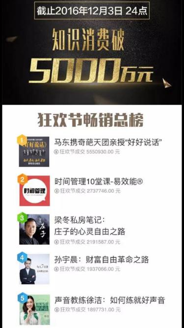 12月3日,喜马拉雅FM举办了首届“123知识狂欢节”。最终,在24小时内,喜马拉雅平台销售额突破5000万元。这个数字也追平了2009年首届“双十一购物狂欢节”的最终销售额。国内知识付费的风口已经到来,知识网红也引发关注热潮。
