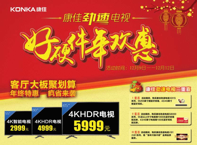 用节点的契碰撞“劲速电视四重喜”:这一次,再聚焦康佳 针对年末旺季,康佳电视大手笔为用户活动放送了四重惊喜。活动期间,用户购买劲速电视X81S及S8000系列,不仅有机会享有元春大福袋、劲速电视大礼包,更有机会获得蓝牙耳机与音响或对应抵扣券,同时,部分地区选购V91与X81S系列还可享受“首年只换不修金牌品质服务”。另外,55英寸4K曲面电视在此次活动中只需不到3000元即能带回家,65英寸大屏4K HDR电视仅6000元。值得注意的是,用户在全国线下康佳电视终端门店均能享受到优惠,千元蓝牙音箱抵扣券可以在康佳微商城的礼品兑换专区使用。 X81S散发薄光溢彩的背后,MEMC+双HDR毫无疑问是魅力之源 产品受到不少用户青睐不止归功于优惠力度,更多应该回归到硬件本身。好比今年自推出起就受到大量用户喜爱的康佳劲速电视X81S系列,在针对增强画质及保护用户眼部健康方面,X81S搭载MEMC全程运动增强技术,完美解决画面拖尾等缺陷、解决这方面对眼睛的伤害。无论是观看动作大片还是体育赛事,甚至玩游戏都能通过X81S高速屏幕精彩呈现,真正实现全程运动增强。 MEMC技术带来的画面流畅是X81S的一大优势,双HDR呈现出的清晰细节作为X81S的另一成功之处则令用户对这台电视更加爱不释手。而作为未来电视的主流技术之一,康佳已经在这方面练就了不少造诣。高端HDR屏幕加上10 Bit HDR解码芯片能够对图片、视频等画面的颜色细节进行12Bit色彩处理,双HDR其中的真彩色轮引擎技术还可以调节色彩,让画面在黑场、暗场、强光、逆光下细节表现得到最大优化,令画面更添完美无瑕。
