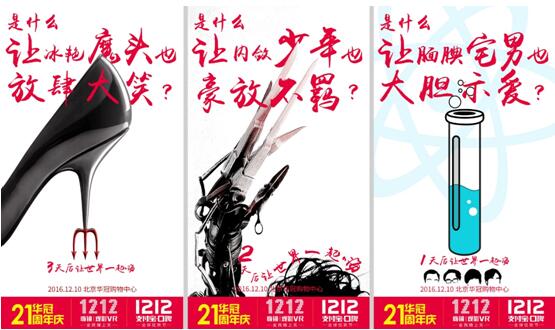 画龙点睛,直击痛点 与传统商超复杂的大红大紫设计风格不同,这一次“华冠21周年庆·暨支付宝双12全球狂欢节启动仪式”在预热海报上却走起了主打悬念的电影简洁风。 白底设计加艳色文案,充分勾起受众的好奇,并且直击痛点,唤起人们关于生活关于电影的记忆。 让受众不惊好奇这次难道华冠要玩跨界营销? 三天倒计时,三部电影,三大人群 通过这3款倒计时,我们不难看出,巧妙地利用数字和图像相结合的形式,三天倒计时海报分别讲述了三部经典影视剧作品:《穿Prada的恶魔》、《剪刀手爱德华》、《生活大爆炸》。这也恰好对应了三类不经常线下购物的人群:忙碌的职场白领、自闭的宅男宅女、内敛的科技人员。 而通过电影这一元素作为设计创意源泉,一方面表现了活动当天有与电影相关的巨幕影院嗨镜可以体验,另一方面,也更加突显了华冠商业懂得用新的方式去刺激更多消费者。 一亿豪赌,10年后,孰赢孰败? 回想在2012年中国经济年度人物颁奖晚会现场,马云与王健林曾约下了一场壹亿的豪赌。截止2022年,也就是10年以后,电商在中国零售市场份额占不到50%,马云就给王健林1个亿;反之王健林给马云1个亿。一个是电商大佬,一个是传统商业的领军人物,马云与王健林四年前打赌,赌注一亿元,可谓赚足了眼球。 而从今天看来,当阿里巴巴双十一以1207亿人民币再创成交额新纪录时,立足线下商超的双十二全球狂欢节所带来的力量也不容小觑。并且,正如这次“华冠21周年庆·暨支付宝双12全球狂欢节启动仪式”一样,当传统商超活动开始了创意营销,那么人们依旧会选择走出房门,拥抱生活,毕竟人作为一种群居动物,自然的属性决定了我们不能独自一人孤独生存。
