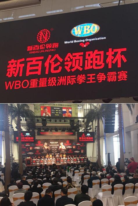 12月9日上午,2016中国·杭州WBO重量级洲际拳王争霸赛新闻发布会暨称重仪式在杭州中维哥德大酒店举行。10日晚上19:30将在杭州市体育馆举行WBO拳王争霸赛。该赛事由杭州市体育局、世界拳击组织、世界职业拳击联盟主办,广东广播电视台、宏德体育、浙江经视、中际拳击、国腾体育、北青集团承办。 本次大赛由新百伦领跑总冠名,大赛选手的运动服饰由新百伦领跑体育用品有限公司全程定制。 发布会出席人员有: 吴石牛(WBO中国首席执行官) 曾德强(新百伦领跑董事长、本次大赛总冠名) 阿地力(WBC亚洲超中量级冠军) 吴志宇(WBC亚洲重量级冠军) 蔡宗菊(世界综合排名前十、IBF洲际冠军、WBC国际冠军、WBC洲际冠军) 韩建平(PBC职业拳击协会执委、BOXREC亚洲首席认证官) 蔡东伟 (浙江宏德体育文化有限公司总裁) 葛俊崧(浙江宏德体育文化有限公司执行总裁) 龙晓韵(深圳金腰带国际休育发展有限公司董事长) 担任本次WBO现场直播的主持人为著名体育解说员韩乔生先生和美丽的苏航女士。