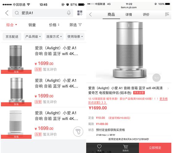 京东首发,享受定金10倍膨胀 继众筹金额突破200万元完美收官后,爱浪小爱A1智能影音伴侣12.12起在京东独家首发,火爆预约正在进行中, 12月22日前预约成功后,10元定金可抵210元,享定金膨胀特权。 二重礼,晒单获赠爱奇异果会员 不得不说,此次爱浪A1的京东首发优惠活动可谓是诚意满满,惊喜连连。12月23-31日期间购买小爱A1,晒单的顾客均可获赠价值149元/季度爱奇艺白金会员VIP会员服务。 三重礼,抢0元免单 12月23日-31日购买并按要求评价晒单的首单用户可获免单机会。此外,第一笔付款的顾客将享受特惠价999元。现在购买小爱A1,福利多多,惊喜爆棚!赶快登陆京东开启你的智能生活时代吧! 购买链接:http://item.jd.com/3713235.html