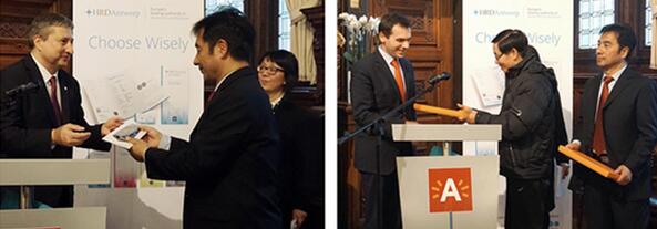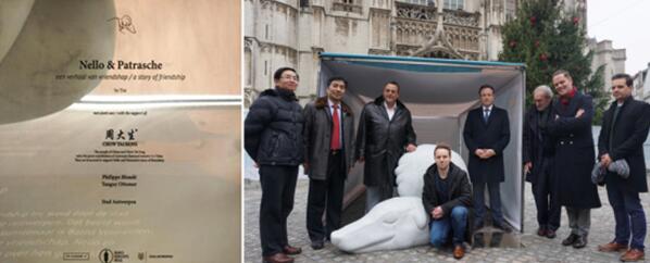 双方互赠礼物,相互表达美好的祝愿 这次钻石文化之旅的另一精彩行程,莫过于城市历史象征雕塑“尼洛与小狗”的揭幕。这座坐落于安特卫普市中心核心地段的雕塑,是由周大生珠宝赞助的“尼洛与小狗”(Nello & Patrasche)雕塑大赛的获选作品,雕塑基座上的中国名字“周大生”格外引人注目。周大生公司董事副总裁向钢先生、董事副总裁卞凌先生出席了雕塑落成典礼,并与安特卫普副市长以及雕塑设计师、创意者一同为雕塑揭幕,随后安特卫普市长对周大生珠宝赞助此次雕塑大赛促进两国文化交流表示了感谢。