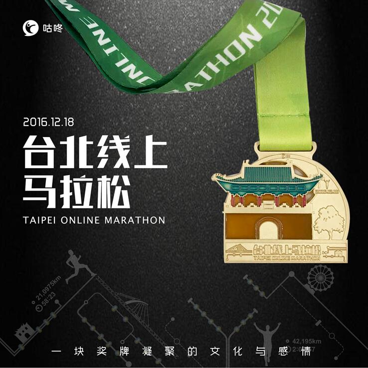 过去20多年里,台湾地区的路跑比赛有了长足的发展,从1993年的10场路跑、2场马拉松,激增到2015年740场路跑,2014年半程/全程马拉松总数达到346场,但没有一项赛事的娱乐特性,能和台北国际马拉松相提并论。在这一天,每个跑者看重的不是成绩,而是一起参赛、一起娱乐的氛围。咕咚之所以将台北线上马拉松塑造成一场追求血脉情结的精神娱乐赛事,也是为了和线下赛的特质相契合。 不管10公里、半马还是全马,参与台北线上赛的咚粉们都带着特殊的情怀,对这场赛事的奖牌,也带着不同的眼光。以日月潭的外形作为创意基础,打造了半圆形的牌体,加上雕梁斗拱的台北故宫博物院造型,“两岸同根”的蕴意也显得格外亲切。 在咕咚举办线上马拉松赛事的三年中,注重精神诉求、强调陶冶情操的线上赛事并不少见,今年更是数量多多,国内赛事如腾冲线上马拉松、义乌线上马拉松、海陆空主题线上跑、鲁迅文化线上跑、月跑一善活动的“重回长征路”等,得到了咚粉们近乎狂热的追捧。除了坚持线上参赛的成就感,还能在奔跑过程中,获得更多的精神享受。另外,全新的完赛虚拟证书也已经在咕咚APP上线,对实物模拟度很高的外观,也让咚粉们完赛之后的心情变得更加靓丽。