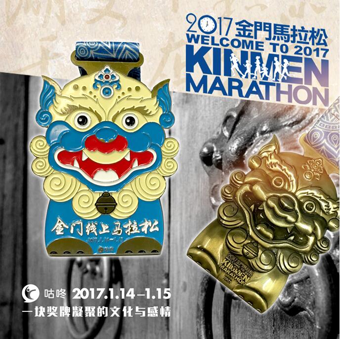 镇兽,是古老的东方符号,幻化出现,抵抗逆境,被民间给予了美好愿望成真的寄托。而“风狮”是闽南地区最有地域代表性的守护神,也是风神,是厦门人公认的吉祥物。厦门线上跑马的奖牌造型源自传统的当地文化,同时加入城市精魂的象征,狮子外形颜色饱和明亮,犹如触目可及,可以想象,一头精妙灵兽在终点等候善跑的勇者来征服,能为咚粉们的步履增添翅膀,带给你我面对疾风的非凡勇气。 “与姊同心,与子同袍”,与厦门对望的金门线上赛奖牌,造型上闪耀着同血同源的创意,同样以闽南民间神兽文化为背景,打造跑马的“双城记”。狮兽设计在细节处凸显离岛金门作为台湾“岛屿明珠”的内核,海洋风格明快吉祥,“同甘共苦”的寓意充盈其间。