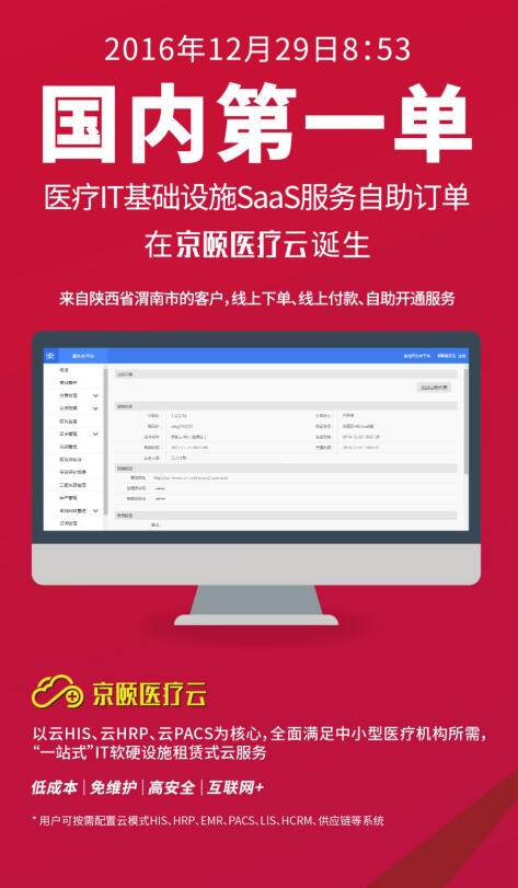 12月29日8点53分,陕西省渭南市高新区白杨办乐天社区卫生服务中心通过阿里云云市场平台在线购买了京颐医疗云应用中的云HIS产品,成为国内医疗IT基础设施SaaS服务首单。