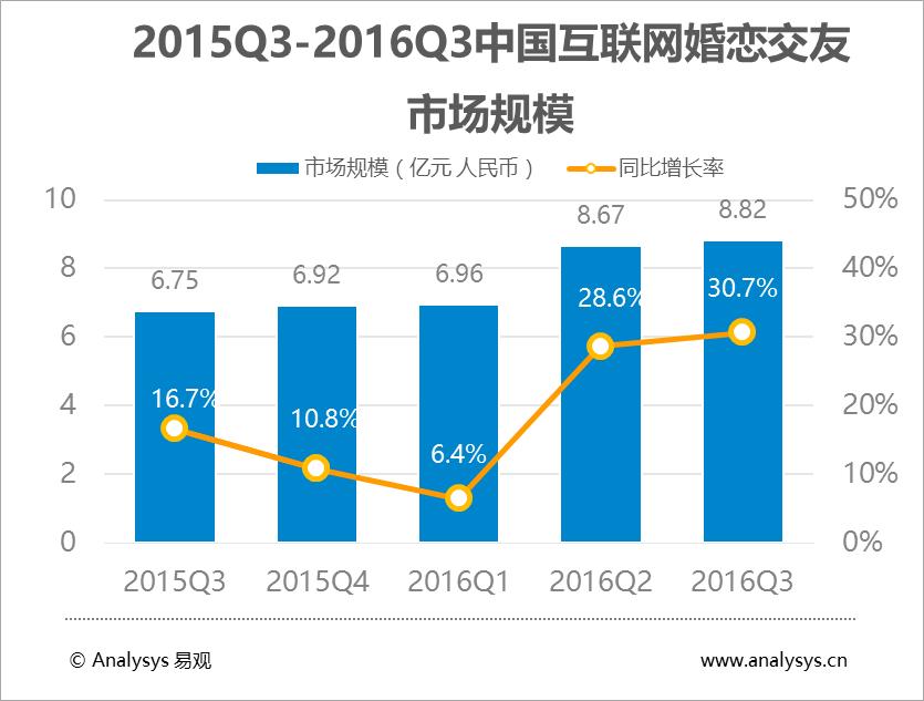 根据Analysys易观发布的《中国互联网婚恋交友市场季度监测报告2016年第3季度》数据显示,2016年第3季度,中国互联网婚恋交友市场规模达8.82亿元人民币,同比增长30.7%。