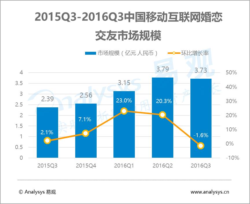 随着移动互联网对婚恋领域的加速渗透,婚恋移动端营收已逐渐在所有婚恋企业线上营收中占据支柱性地位。2016年第3季度,中国移动婚恋交友市场规模达3.73亿元人民币,环比下降1.6%,同比增长56.1%。Analysys易观分析认为,伴随90后逐渐成为婚恋交友主体人群,线上婚恋交友也开始向更为社交、互动,强调用户感知与体验的方式改进。第3季度线上新增的视频约会、问答社区服务形式,不仅使在线婚恋交友形式更为活泼,增加了用户活跃度,对在线婚恋厂商沉淀用户情感内容,及时了解市场需求以提供更具针对性的产品和服务也提供了支持。 |