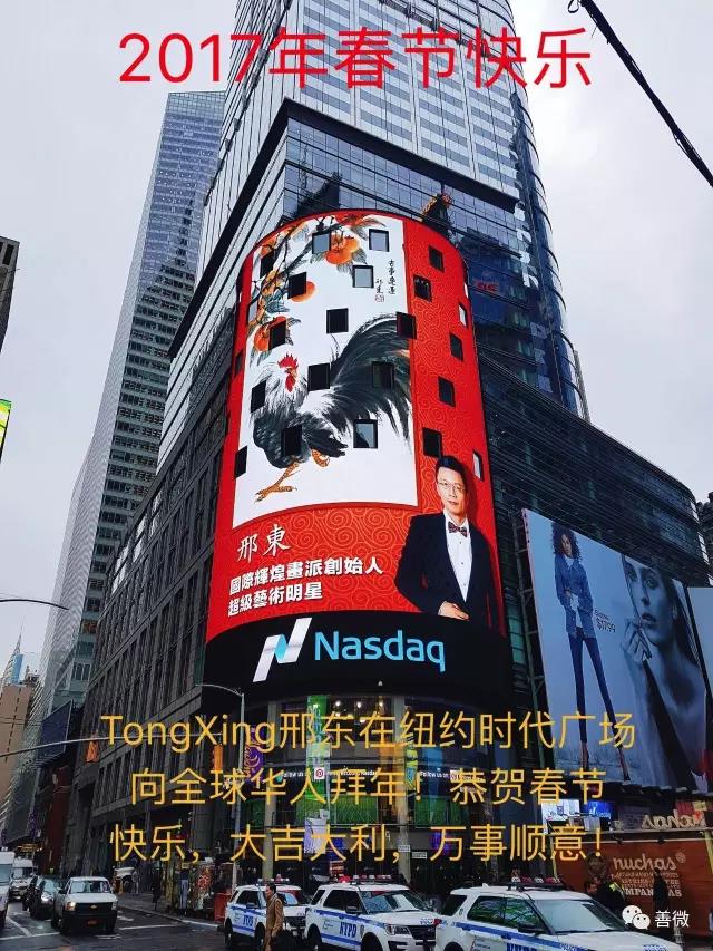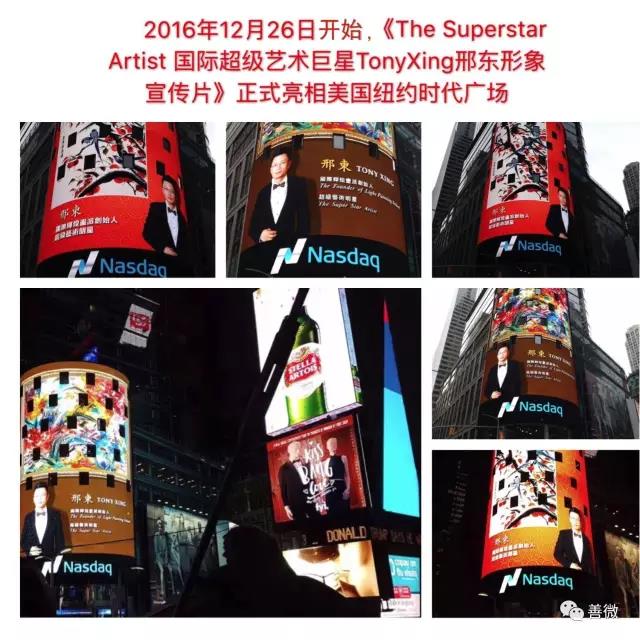 2016年12月26日《The Superstar Artist 国际超级艺术巨星TonyXing邢东形象宣传片》正式亮相美国纽约时代广场巨幅荧屏,恰逢圣诞节期间,是广告的最佳黄金时间,也是时代广场人流量最大的时段。全天候18次循环播出。这是全球第一个艺术明星登上时代广场荧屏。本次形象宣传片旨在配合宣传TonyXing(邢东)作品合作全球32家品牌预售作品版权、多家品牌形象代言及2017年邢东经典代表作品世界七大城市巡回展。 2017年中国传统节日除夕和春节,国际超级艺术明星TonyXing邢东再次登上纽约时代广场巨幅荧屏向全球华人拜年,这次贺年图片特别选用了他的代表作品《吉事连连》作为画面,并用大红色和中国云纹图案作为底色,整个画面喜庆吉祥,寓意:祝福伟大的祖国繁荣昌盛!祝愿全球的华人春节快乐,吉祥喜事连又连! 2017年除夕、春节期间,纽约时代广场以每天24小时平均21次的频率播出TonyXing邢东向全球海内外华人同胞拜年视频和图像。