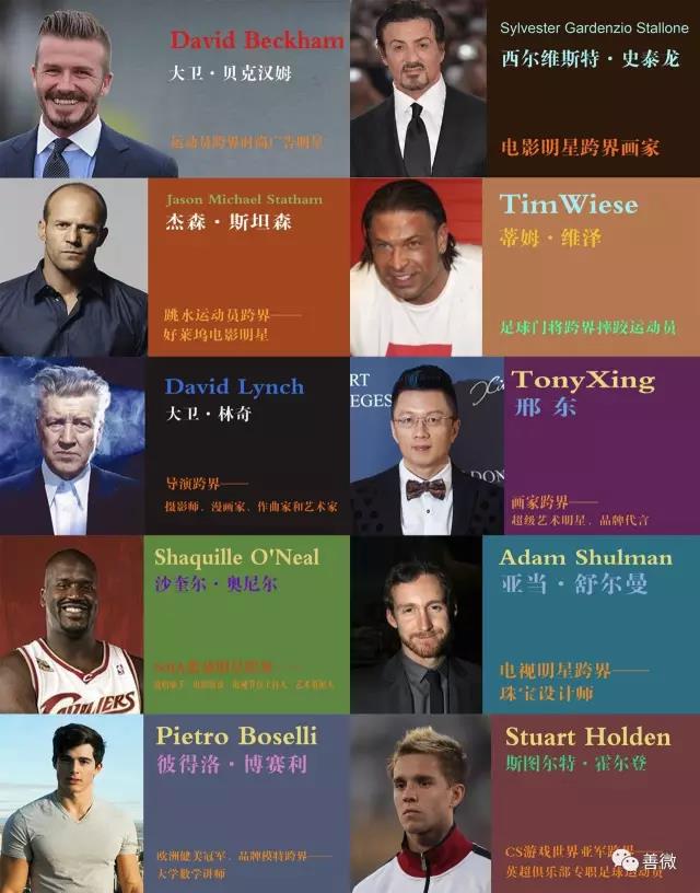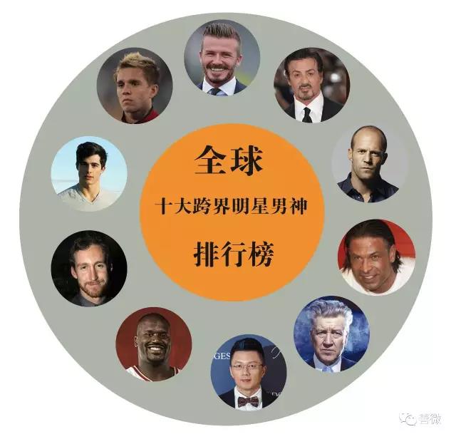 本次当选的全球十大跨界男神明星依次是:大卫·贝克汉姆、西尔维斯特·史泰龙、杰森·斯坦森、大卫·林奇、托尼·邢东、沙奎尔·奥尼尔、蒂姆·维泽、亚当·舒尔曼、彼得洛、霍尔登。